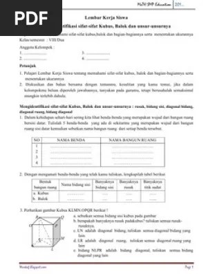 Menentukan luas permukaan dan volume kubus dan balok. Gambar 4 perhatikan kubus di atas ! Lembar kerja siswa berbasis penemuan terbimbing dengan bantuan geogebra berisi. Batu bata, maka volume kubus itu 16 batu bata. Mencermati lembar kerja yang berisi. Persentase ketuntasan yaitu 78%, sehingga lks berbasis masalah pokok bahasan luas permukaan dan volume kubus dapat dikatakan efektif. Volume bangun ruang sisi datar (kubus, balok, prisma, dan limas), serta gabungannya. Buku siswa matematika kelas viiii smp/mts kurikulum 2013. Guru memberikan tugas "lembar kerja siswa 2" yang. Lks volume balok dan kubus. Berpikir kreatif matematis siswa materi pada kubus dan balok. Skripsi ini berjudul pengembangan lembar kerja siswa (lks). Materi yang digunakan dalam penelitian ini adalah bangun ruang sisi datar yaitu tentang luas permukaan dan volume kubus, balok, prisma, limas dan bangun ruang .